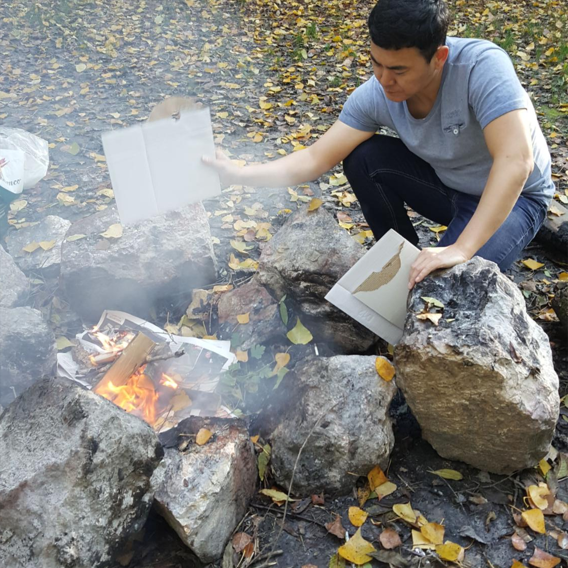 드디어 신문지를 돌돌 말아 라이터로 불을 피운 후 불쏘시개에 불을 옮겨 붙입니다.
