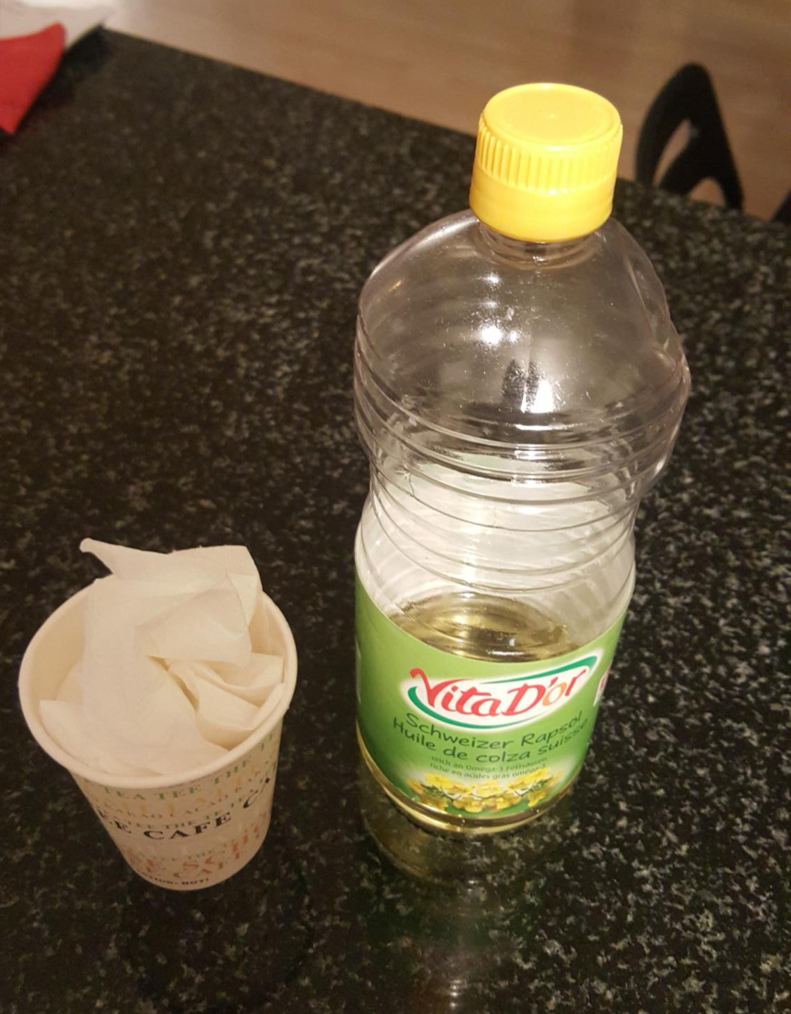 만드는 방법은 종이컵에 키친타월을 넣고, 식용유를 부어서 적셔 주는 거예요.