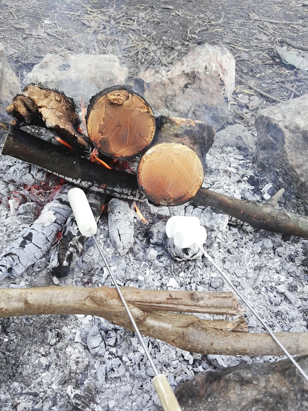 미리 만들어간 꼬챙이에 마시멜로를 끼워 숯에 굽기 시작합니다.