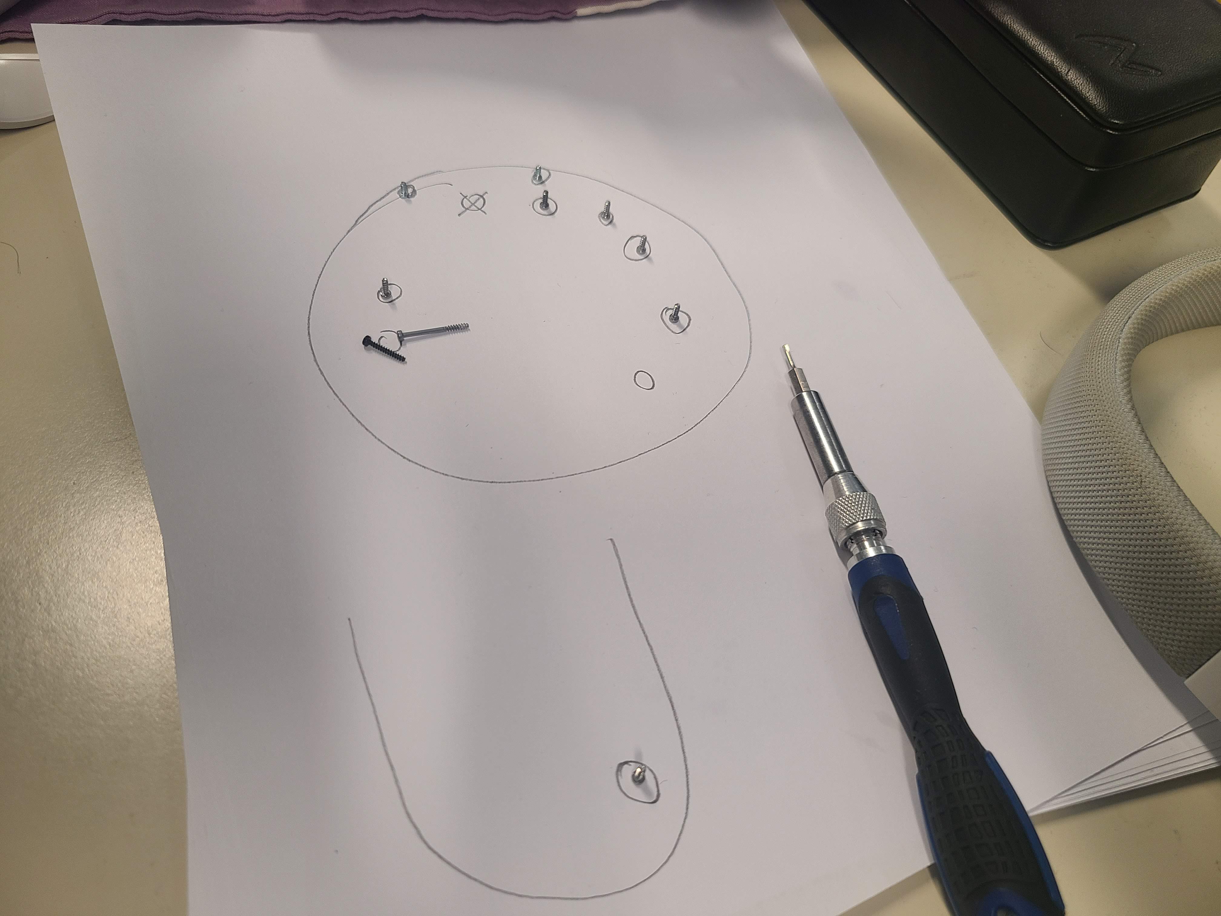 스크류가 여러 종류가 있기 때문에 다시 재조립을 위해 대략 그림을 그려두고 거기 위치에 놓았어요.